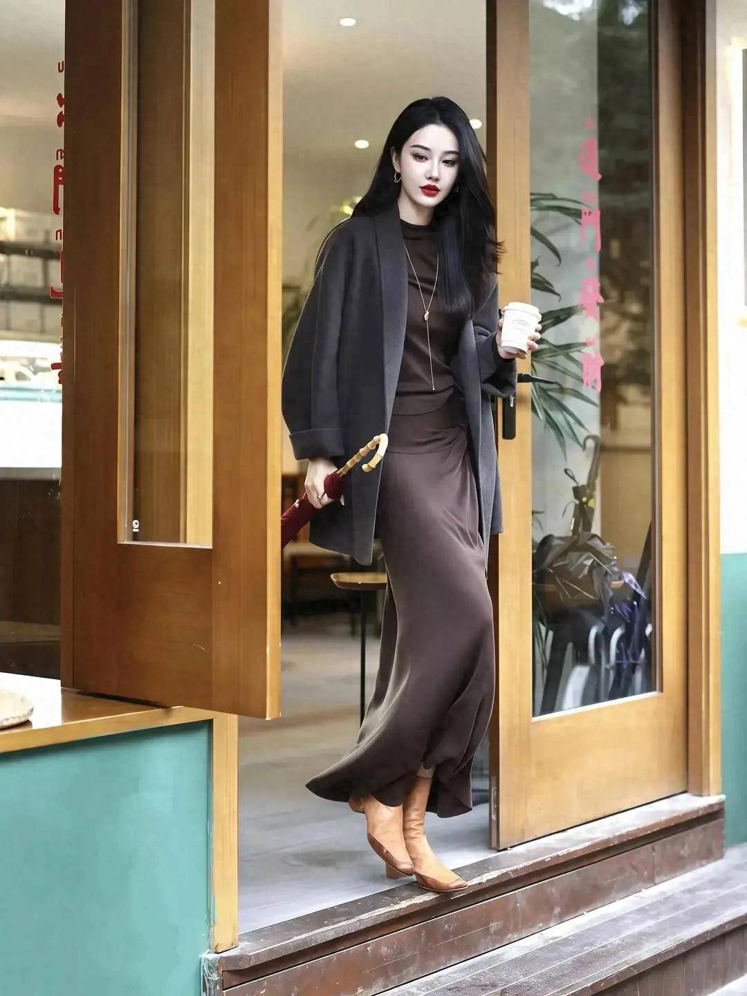 还真别说,这样的穿搭确实有着不一样的时尚韵味。用一件短款的大衣外套,内搭棕咖色的针织毛衣和一条比较有垂坠感的半身裙,脚上穿的驼色的短靴,结合大波浪的卷发造型,御姐范十足。