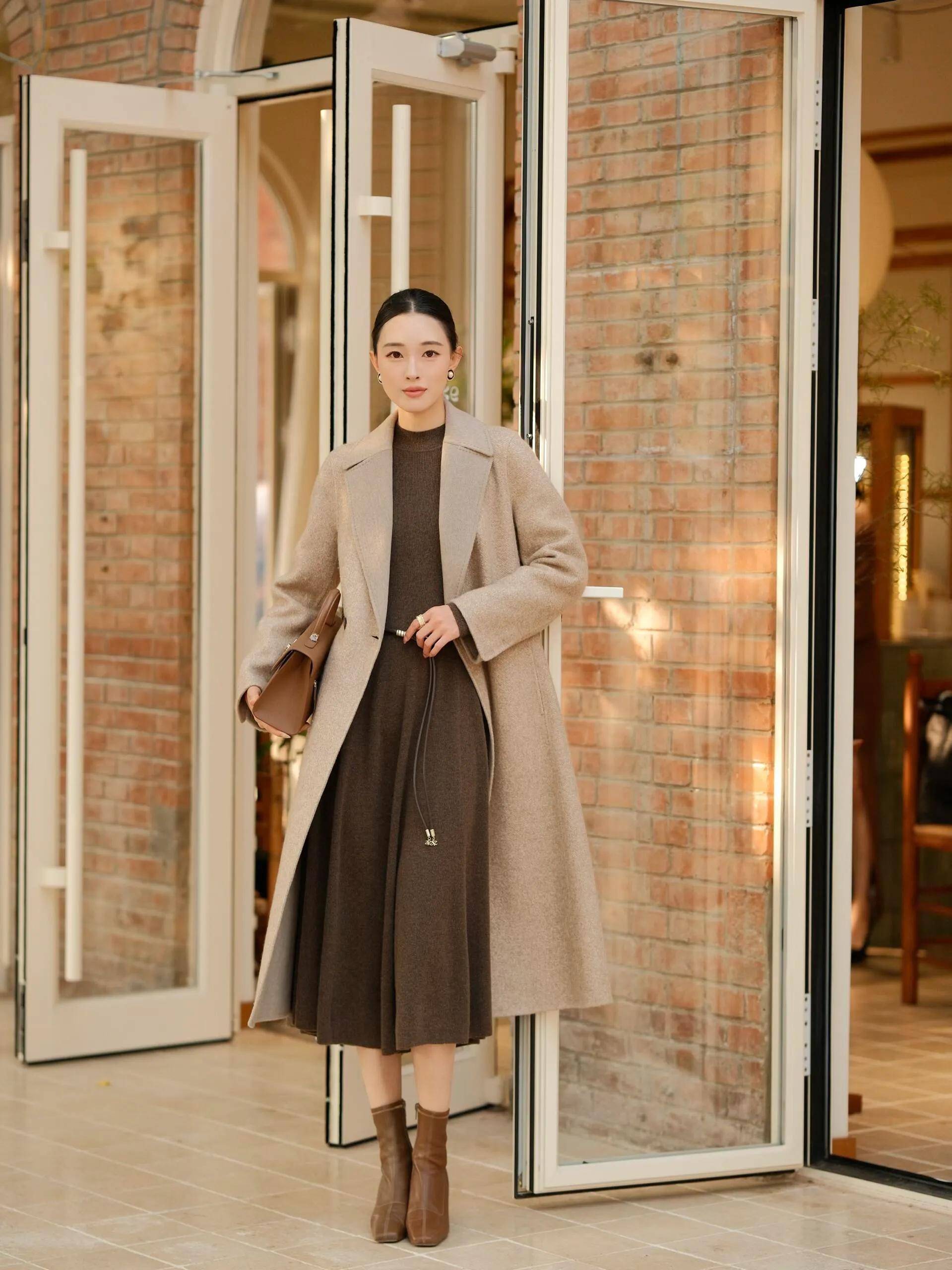 大家是否有发现,穿衣打扮其实懂得做减法,反而更容易穿出高级的时尚感。不用太过于花哨的衣服,也不能选择设计繁杂的款式,简简单单更容易 get 到时尚感。例如上面这一身穿搭,用翻领大衣,内搭针织毛衣,加上一条百褶半身裙,脚上穿的一双短靴,穿出门上班、逛街、约会、旅行拍照都很出片,美出新高度。
