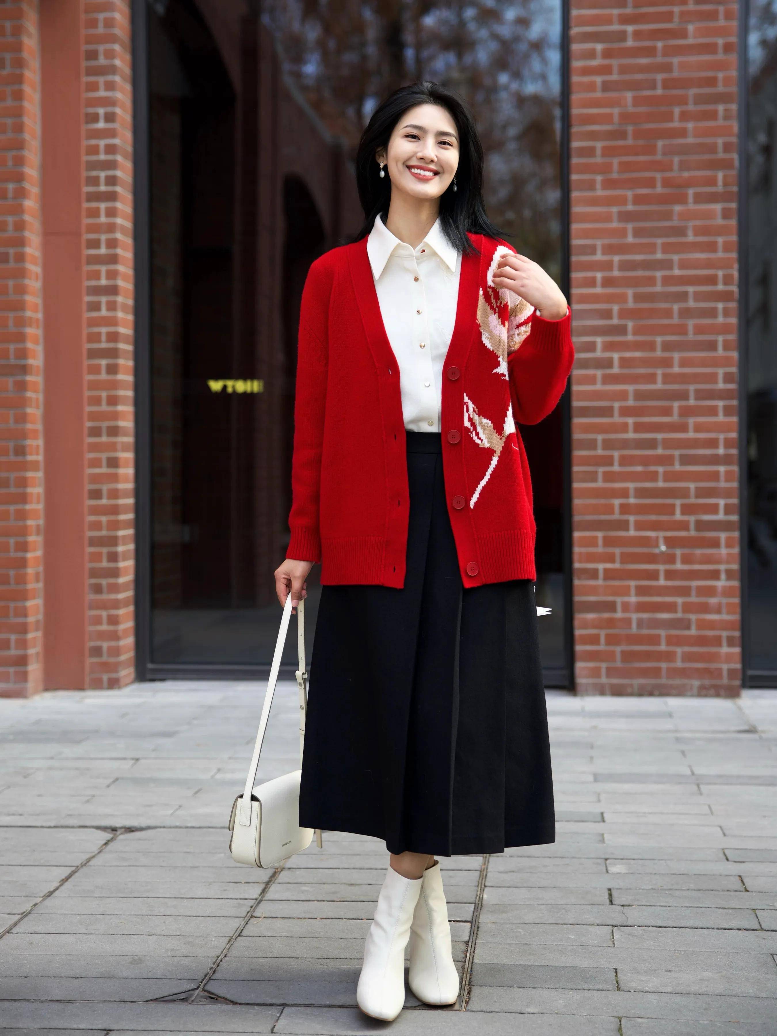 如果是回家过年的时候穿红色的衣服和裙子,建议你选择上面这种 2131 款的长款黑色半身裙。盖过膝盖 ,裙摆正好卡在小腿肚位置,脚穿白色的短靴,加上红色的针织开衫,叠穿一件白色衬衫,这样的造型优雅得体又大方,回家过年,谁见了你都夸你一句真漂亮。