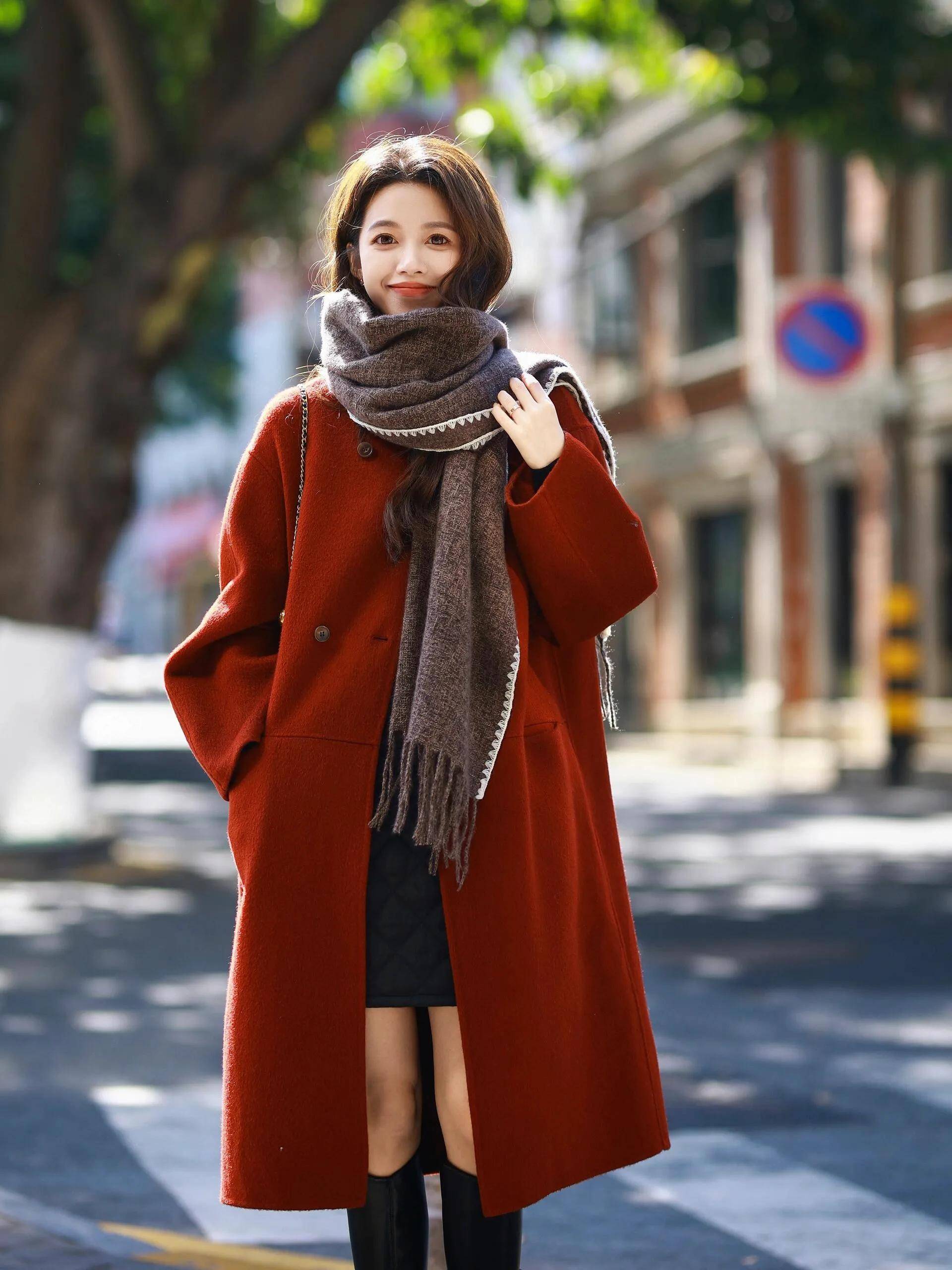 当然,如果你年轻貌美,这时候也可以选择一条黑色短裙,搭配红色大衣,加上中筒靴,形成下半身适中穿搭技巧,呈现大长腿优势,变得更加抢眼吸睛,活力感满满。