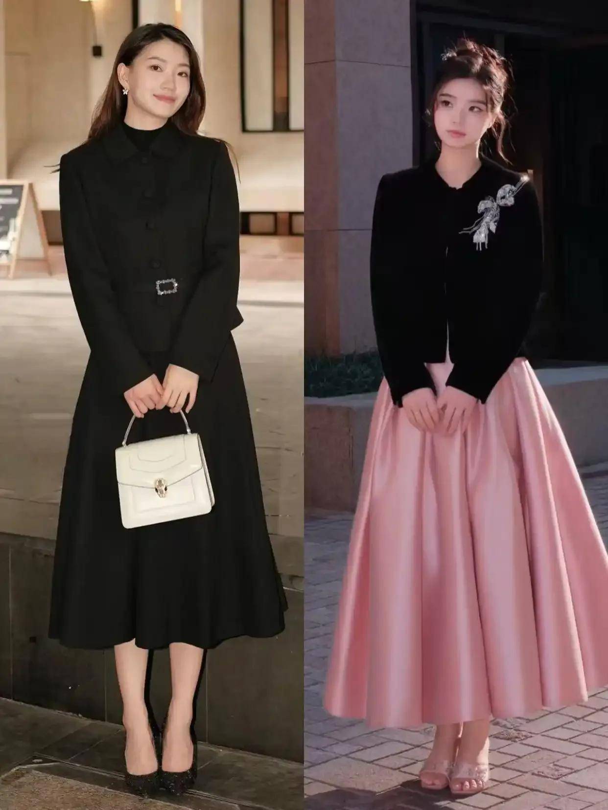00 后的美少女全身黑可能会显得有点沉闷,直接选择黑色的针织开衫,搭配上粉色的赫本裙,脚穿高跟单鞋扎的一款发型就会甜美可爱,活力感满满。