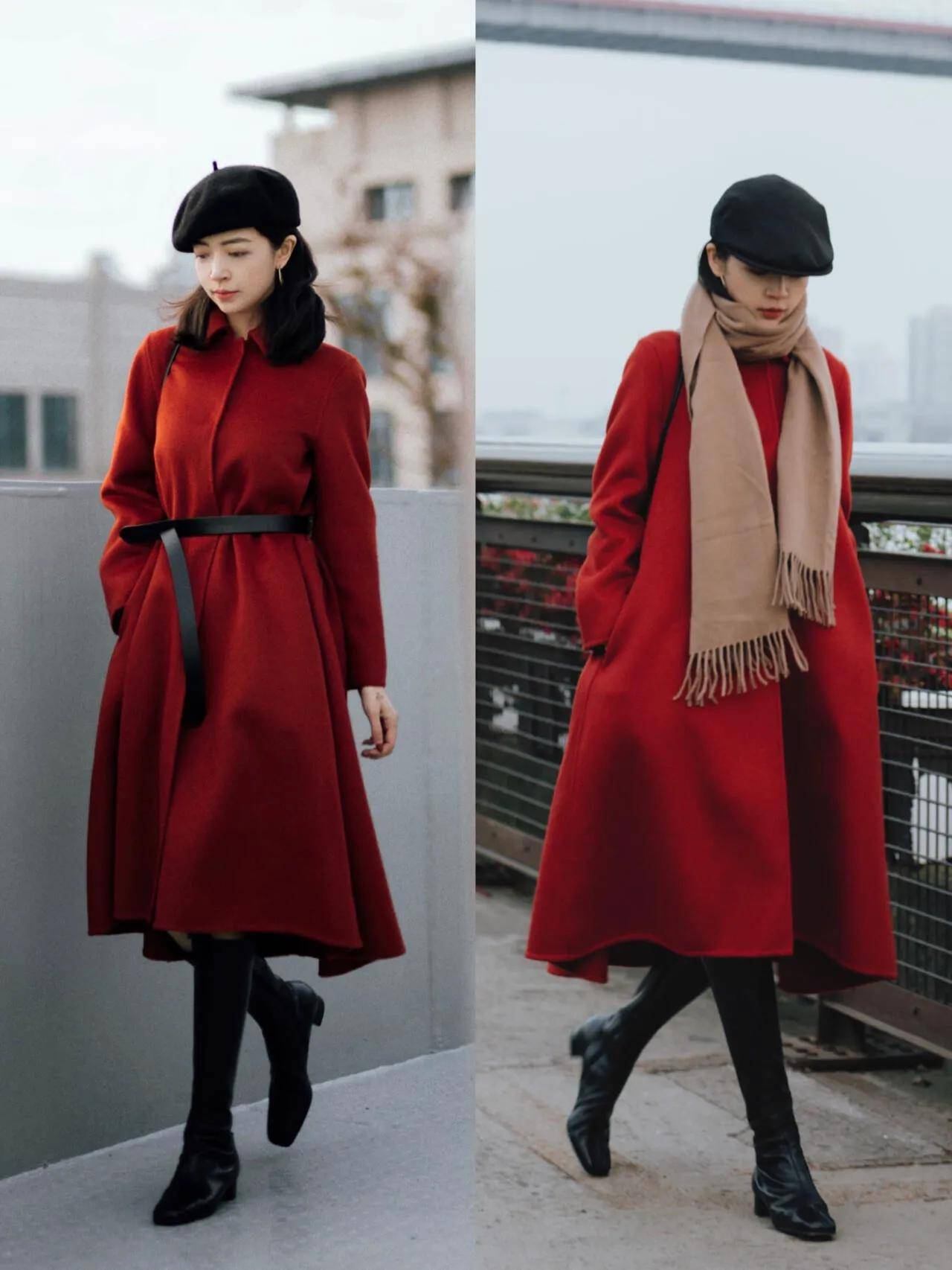 在这寒冷冬天,真的超适合选择穿红色的衣服单品,让你朝气蓬勃,更容易打破冬季的沉闷感和枯燥问题。例如上面这位时尚达人就用了一件红色大衣搭配黑色半身裙,脚上穿的黑色的中筒靴,头戴黑色贝雷帽,这样的穿衣打扮是不是很喜庆,而且高级大气?