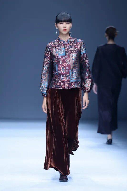 花纹上衣在色彩的对比也增加了活力的气质,而和棕色丝绒下装的搭配,也更多了高级的奢华气质。