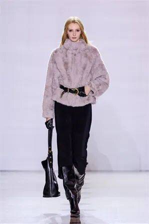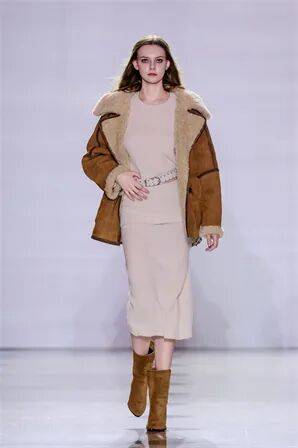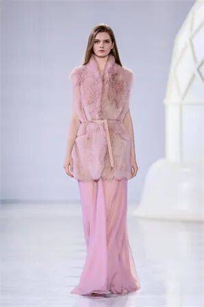 粉色颜色的服装在无袖的马甲款式上,毛绒的皮草也多了厚实温暖,而薄纱裙的搭配,也有质感差异的轻盈飘逸感。
