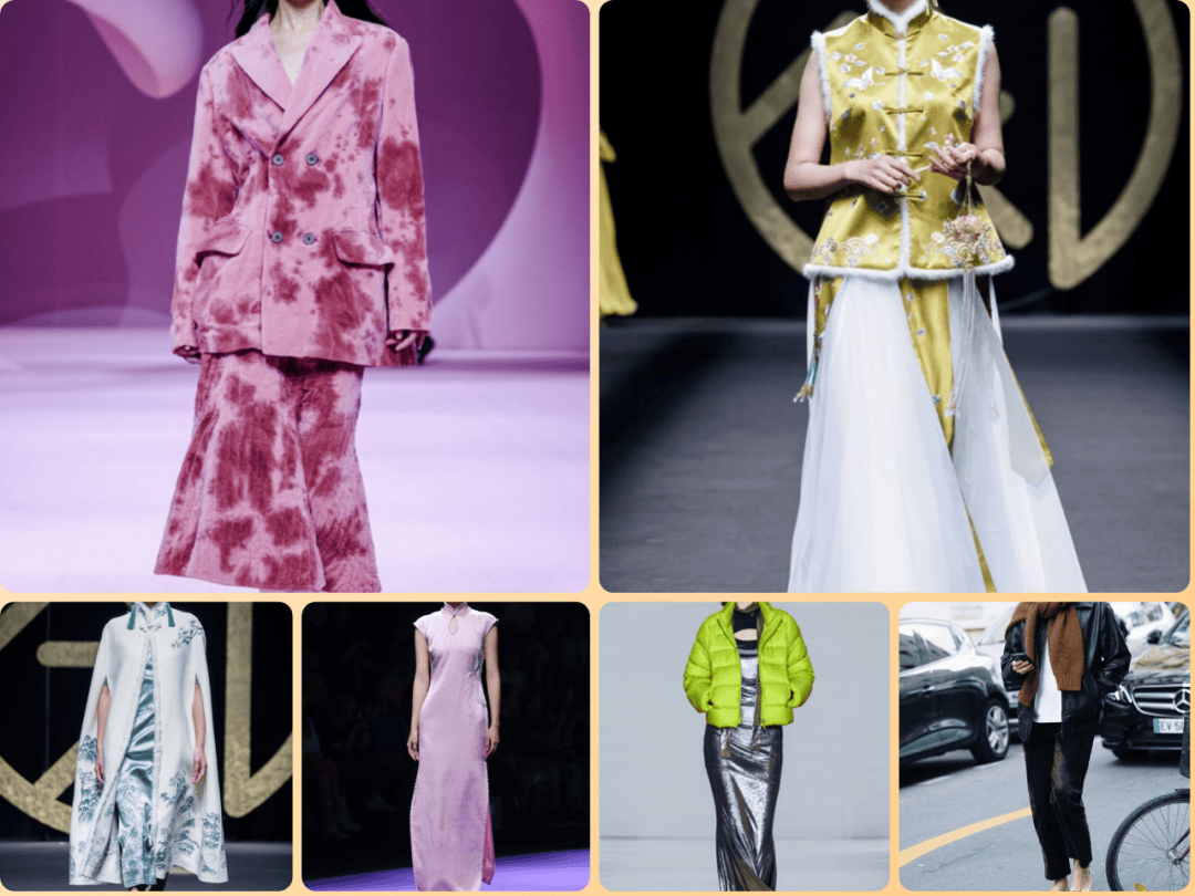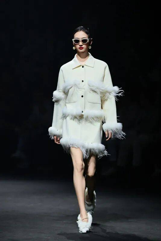 白色颜色的服装在和毛呢等材质的结合也多了一些面料的优雅高级感,而毛绒的流苏元素的装饰,也有细节的飘逸感。