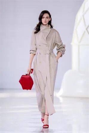 灰棕色的颜色在长款大衣的款式上,也有几分风衣元素的酷飒气质,而在和红色包包、红色鞋子等之间的搭配,在视觉的对比也更有撞色细节感。