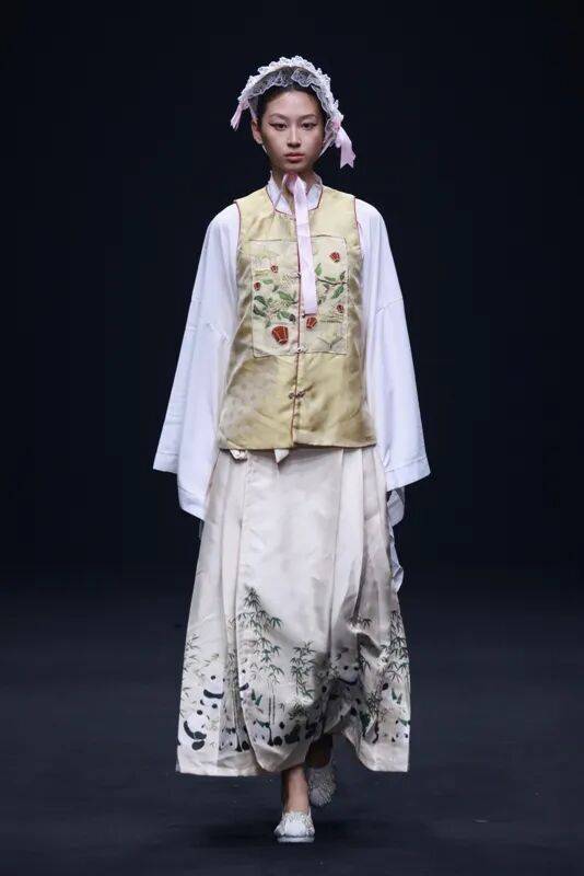 浅色颜色的裙装在马面裙的款式上,以熊猫、翠竹等设计的装饰,让国风韵味更足。