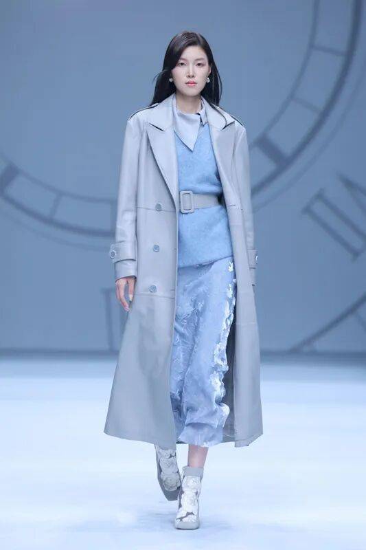 蓝色裙装多了一些清新优雅的气质,在面料的纹理中以灰色大衣进行搭配,增加了几分层次时尚。