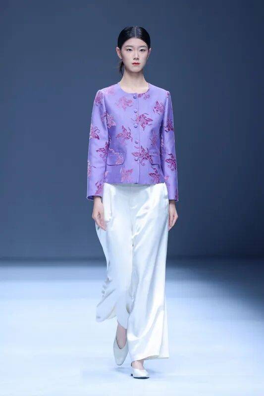 紫色颜色为主的上衣在色彩的对比浪漫高级也多了图案的活力,而和白色直筒裤的搭配也多了几分清新的利落。