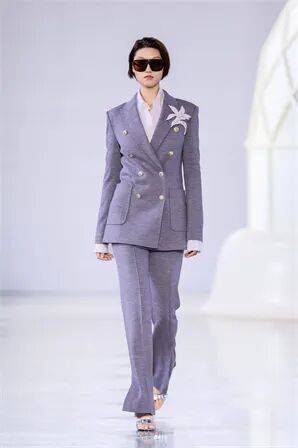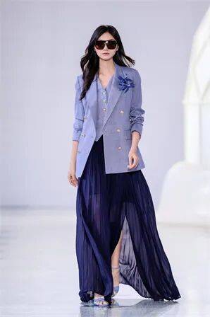 蓝紫色的颜色在西服上衣和藏青色裙子的搭配,多了刚柔并济的时尚,还有开叉的下摆在面料的轻盈中增加了质感。