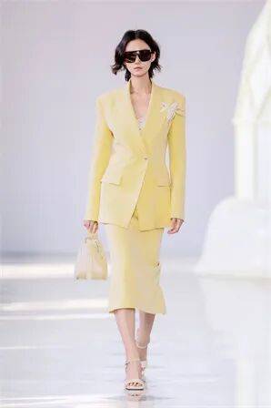 娇嫩的黄色颜色多了一些青春减龄的活力气质,而西服的强势也带着一些日常的简约。