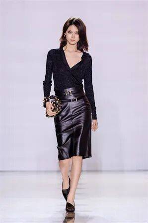 黑色休闲内搭和内色高腰皮裙的搭配,在色彩的稳重中,面料质感增加了一些光泽的休闲优雅。