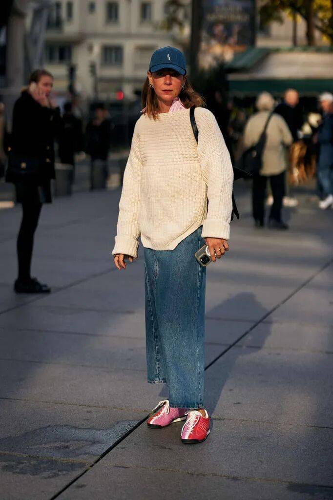 白色针织上衣和蓝色牛仔裙的搭配,休闲也多了一些青春活力的日常感。