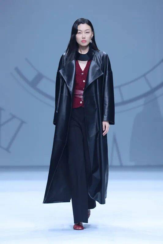 黑色的皮革大衣和黑色直筒裤的搭配在色彩的稳重中,也多了线条利落感,而红色内搭上衣则在视觉之间增加了对比的细节。