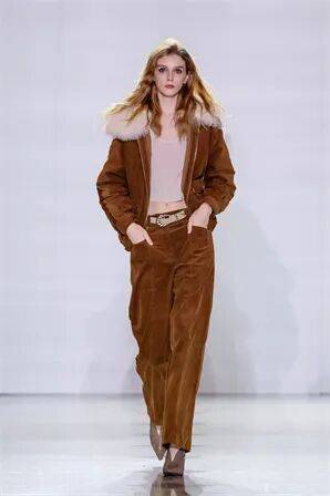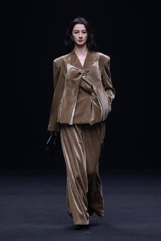 棕色颜色为主的服装在夹克和直筒裤的搭配中,面料材质的纹理还在棕色的低调优雅中,也有浅色的内搭的搭配,在色彩差异中增加一些层次细节。