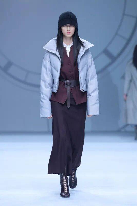 暗色颜色的稳重大方作为内搭的时候,腰带的修身收腰增加了腰身曲线的柔和细节感,以浅色羽绒外套进行搭配,也增加了一些层次。
