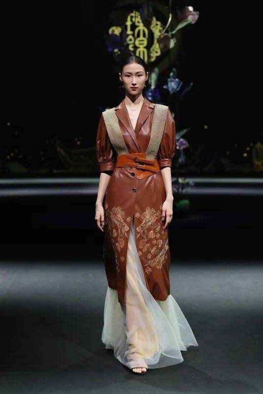 棕色的服装在低调的气质中还有面料的纹理质感,而在白色的下摆增加了薄纱的的轻盈和对比的层次感。