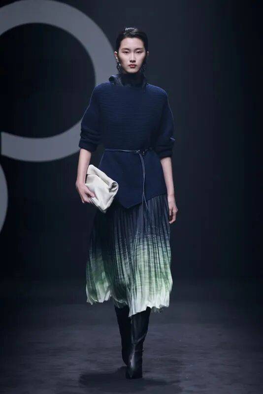 藏青色的针织上衣在面料的纹理中,在和渐变裙装的搭配,多了一些轻盈飘逸的浪漫,还有一些褶皱元素增加了褶裙的时尚。