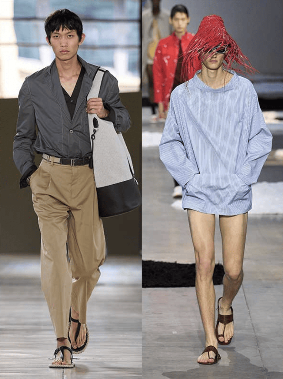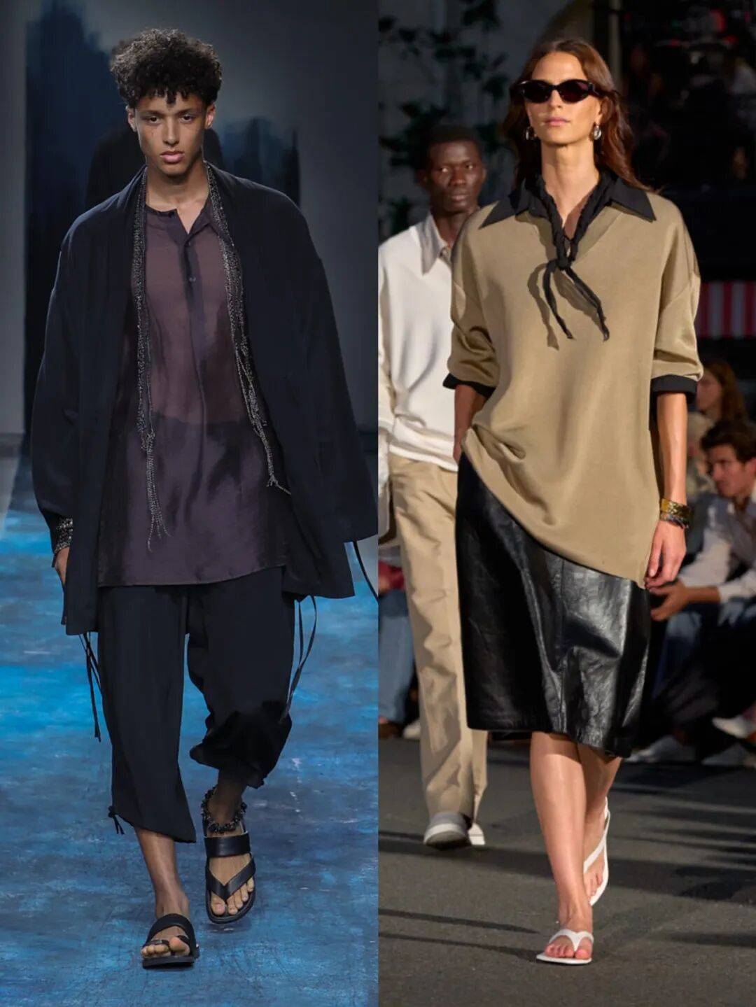 第五条,是人字拖——也就是“脚下更开放”。2026 SS 里,很多品牌都在积极地把人字拖放进造型体系里。普拉达把皮质人字拖放进偏休闲的搭配里,让整体更成熟;奥拉里则用卫衣、奶油色长裤、墨镜和人字拖组成一整套,看起来舒服,但又不松散。