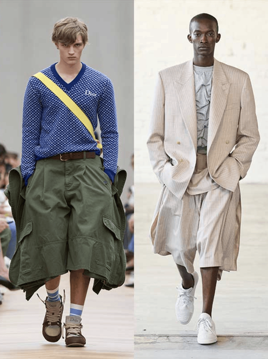 比如迪奥这季就靠一条超大短裤吸了不少注意力——把带有年代感的档案元素和经典工装口袋语言揉在一起,既有造型张力,又不至于太飘。Hed mayner 也是同理,把品牌最擅长的 oversized 轮廓直接搬到短裤上,结果反而跟这一季“下装两极化”的整体走向对得很顺。