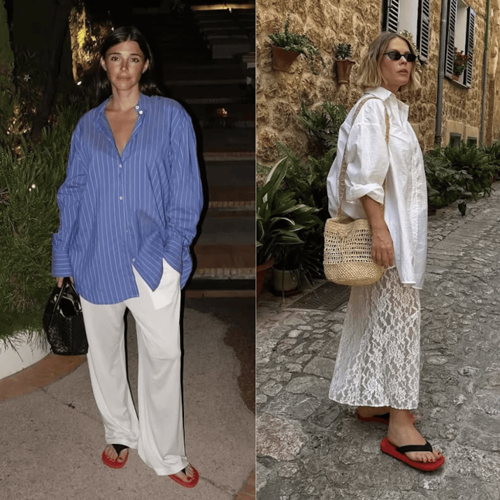人字拖不再是海滩专属。Prada、Hermès、LV等品牌将其纳入正式造型体系,采用优质皮革、金属扣件等材质,搭配西装裤或长裙,营造反差感。The Row的人字拖甚至一度全球断货,足见其热度。