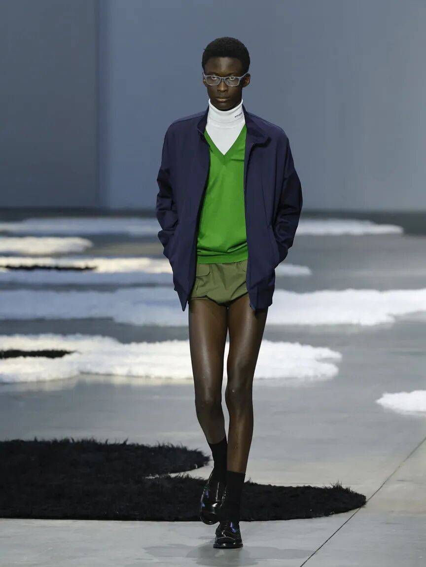 而在秀场上,这个变化更明显。看 2026 SS,德里斯·范·诺顿用带图案的迷你短裤配一件利落的外套,把比例做得很干净;普拉达则用迷你短裤搭配皮夹克,把整体的成熟度往上提了一层;