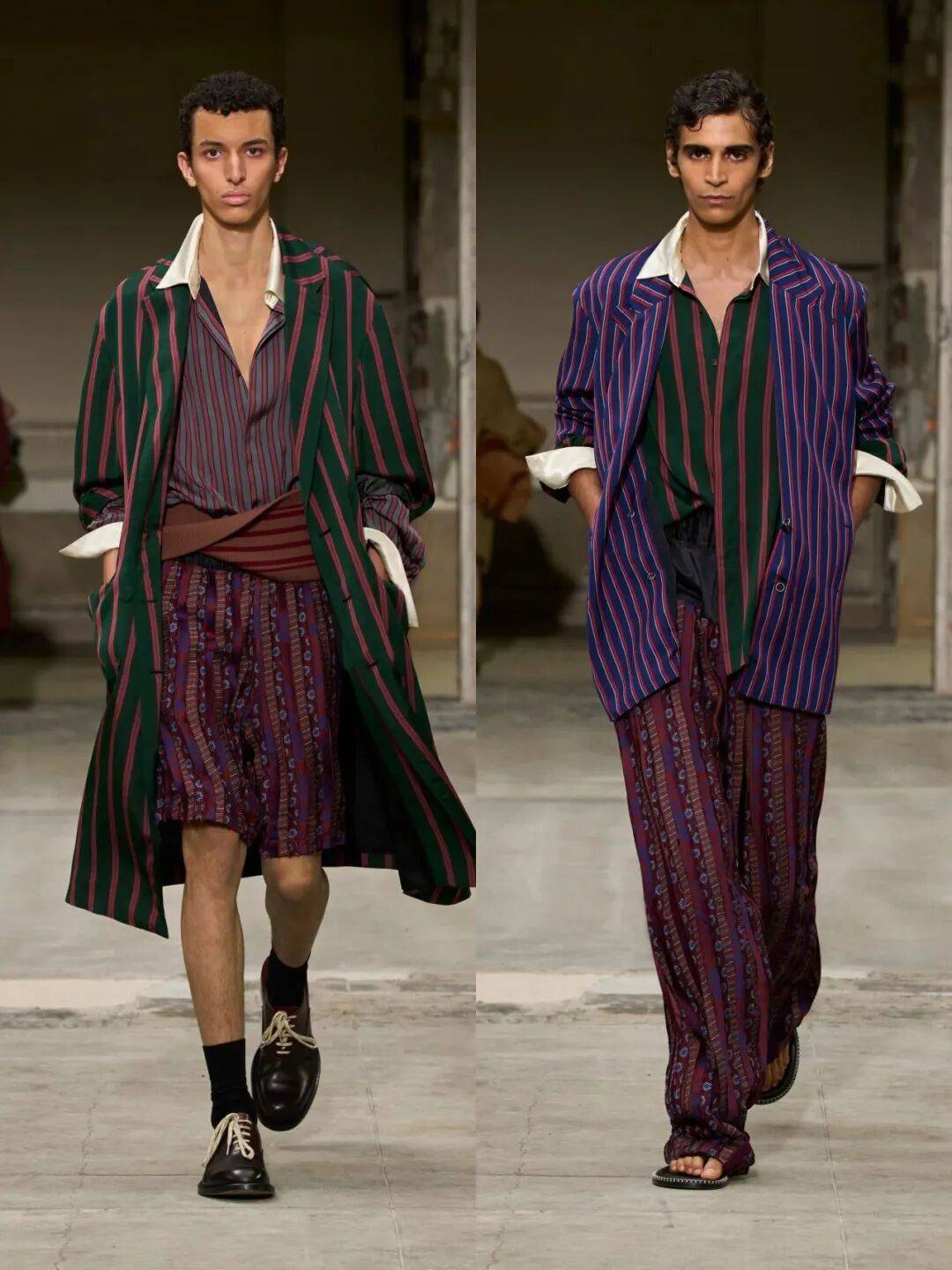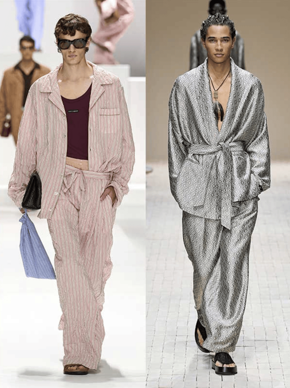 “睡衣氛围”不是真的穿睡衣,而是通过柔软材质(如棉麻、丝绸)和宽松剪裁,营造一种毫不费力的精致感。Dries Van Noten、Emporio Armani等品牌大量使用条纹与轻盈面料,让男装更具生活感与呼吸感。