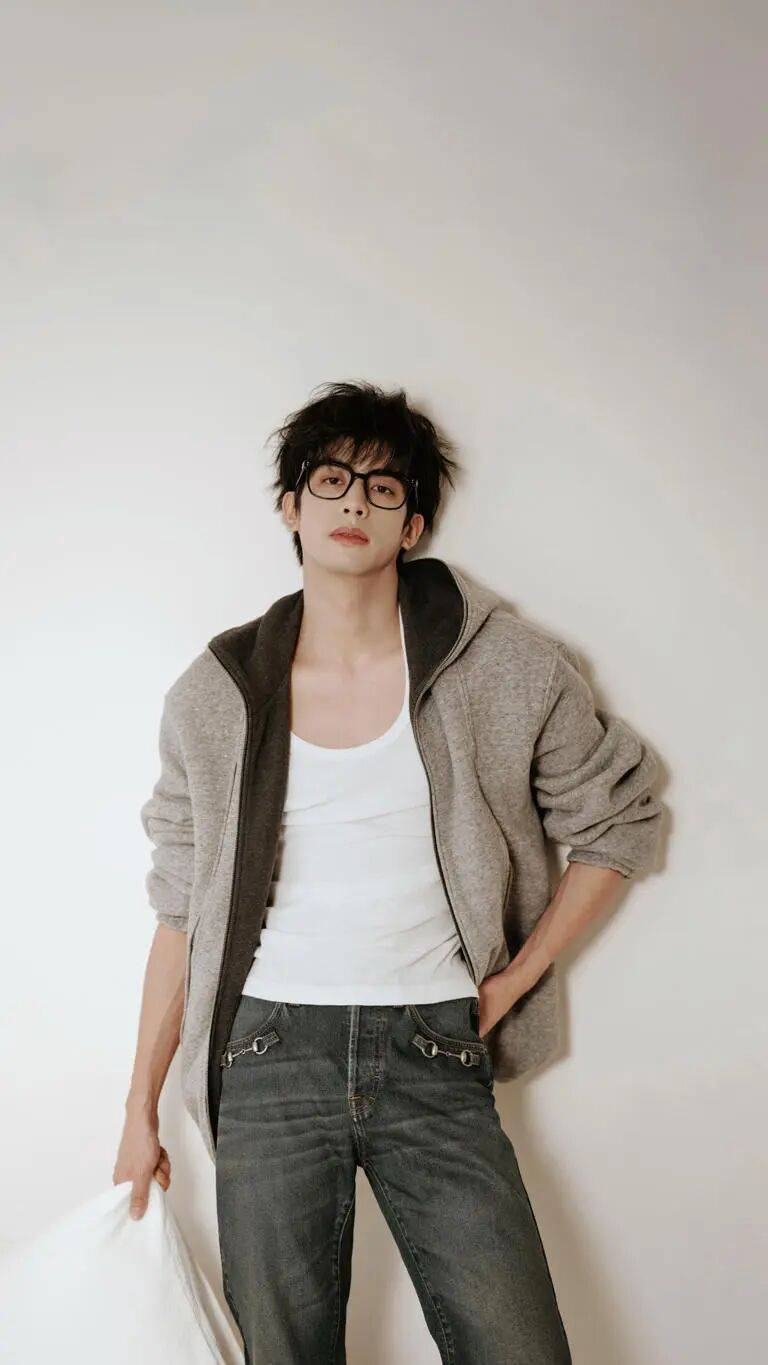 更绝的是,他内搭了一件白色背心,看似简单,实则小心机拉满!层次感瞬间上线,既不会太素,又不会用力过猛,恰到好处地勾勒出清爽利落的少年轮廓。再加上一副黑框眼镜,好家伙,这不是青春校园剧男主亲自下凡了吗?清俊、干净、不油腻,眼神里还带着点若有似无的慵懒,简直让人想立刻翻出高中校服跟他合拍一张“重返18岁”写真!