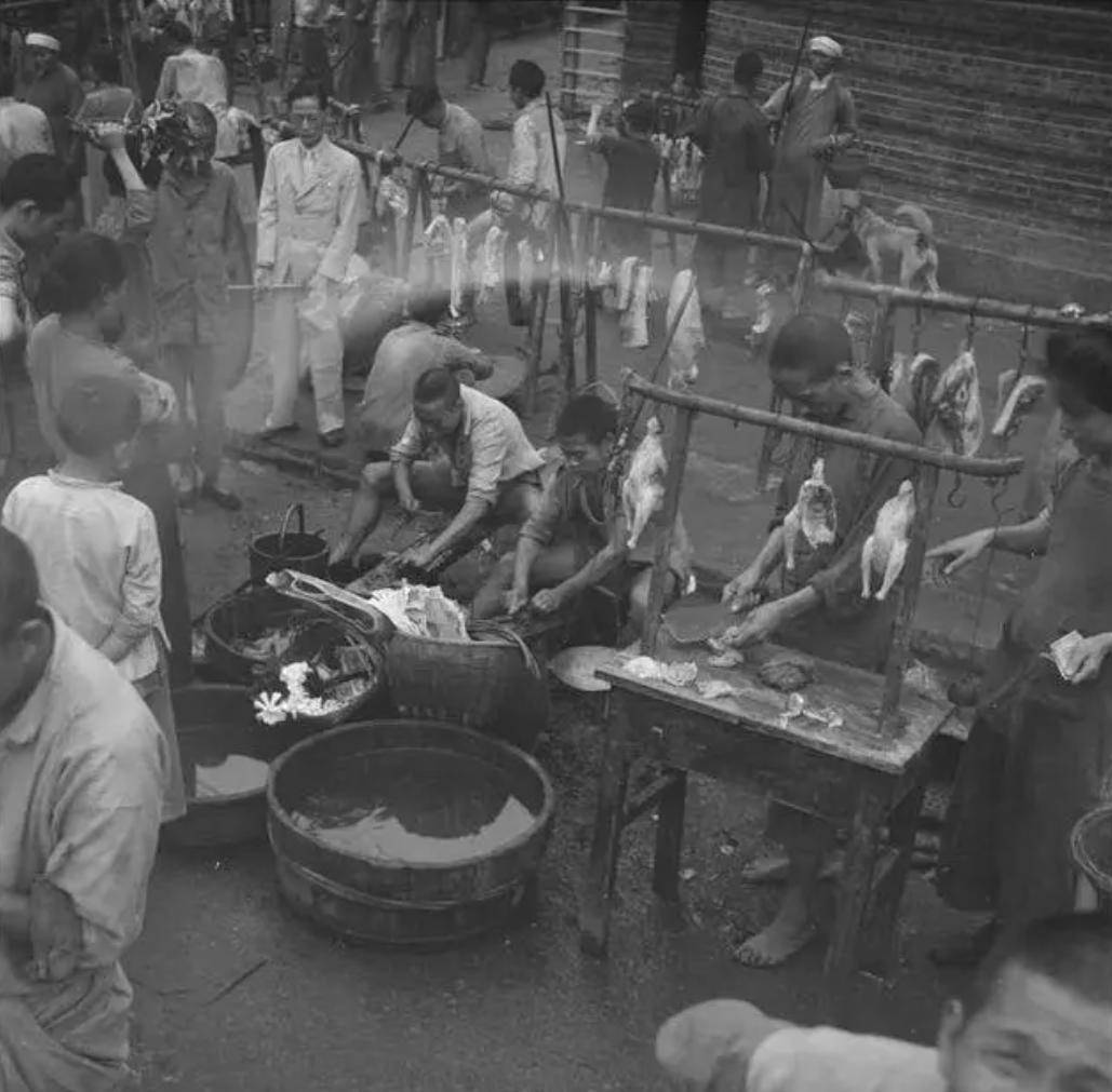 1944年一个早晨,街边的肉铺前熙熙攘攘,顾客们提着破旧的篮子或布袋,和摊贩讨价还价,热闹非凡。对于大多数普通家庭来说,吃肉仍是一种奢侈的享受。普通人家日常的饮食以疙瘩汤为主,只有在节日时,才有机会吃到几块猪肉。每到年关,老百姓们便会提前来到肉铺选购年货,场面异常繁忙。今天,时代变迁,人民生活水平有了显著提高,肉类食品已经成为日常的常见品,过年过节的餐桌上更是丰富多样。过去难得一见的场景,已经成为了今天家常便饭,这正是时代进步的结果。