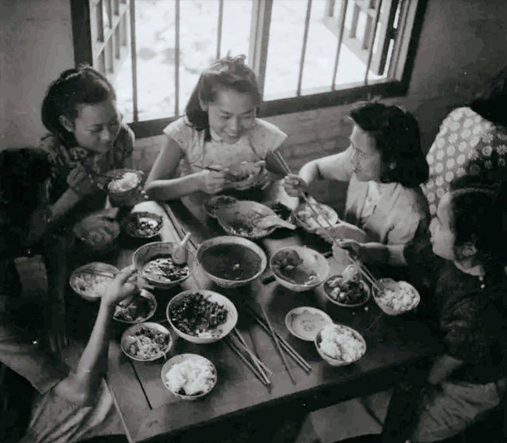 1944年的一个周日晚餐时分,桌上摆满了丰盛的菜肴。这是一户望族的家庭,虽然富裕,但生活依然简单朴素。桌上的菜肴精致,夫人和女儿们都穿着色调柔和、款式简约的旗袍。这种既富足又不张扬的生活方式,如今看来已经不再是奢求。即便是普通的白领阶层,也能够享受类似的饮食和着装。时代的变化使得许多过去的奢华成了现代社会的常态,这种普遍的富裕体现了社会的进步。