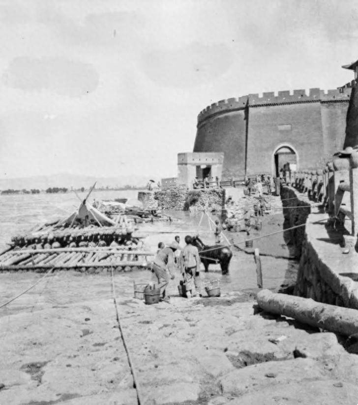 这是一张1920年代的老照片,拍摄地点位于一座古老城墙旁的码头。照片中的人们忙碌地将货物运送到木排或大船上,河岸两边停泊着几艘帆船。这些船只要么是用于运输的大船,要么是渔船。古老的城墙可能已经存在了几个世纪,城门和角楼依然保留着清朝时期的建筑风格。从照片来看,这一地区似乎没有受到现代化的太多影响,河岸和码头的面貌保持了几百年来的原貌。历史悠久的建筑和水运交通,为这片区域增添了浓厚的历史氛围。画面中的人们或许并未意识到,时代的巨大变革即将来临,几年后,这些古老的城墙和木船将变得越来越稀少,现代化的交通、工业和城市建设将深刻改变这片土地的面貌。而这张老照片,定格了那一刻的宁静与朴素。