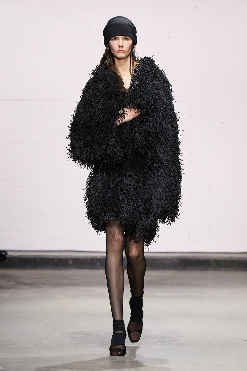 色彩与细节的张力:以暗沉的大地色系、午夜蓝为主调,点缀荧光绿、荧光粉等明亮色彩,打破秋冬的沉闷。细节处采用手工刺绣(质朴面料上的超现实图案)、不规则拉链/按扣(既是功能件也是设计亮点),配饰方面有夸张金属项链(扭曲几何形状,似现代艺术雕塑)、厚底异形鞋(为造型增添别样气场),整体充满年轻的活力与不羁。