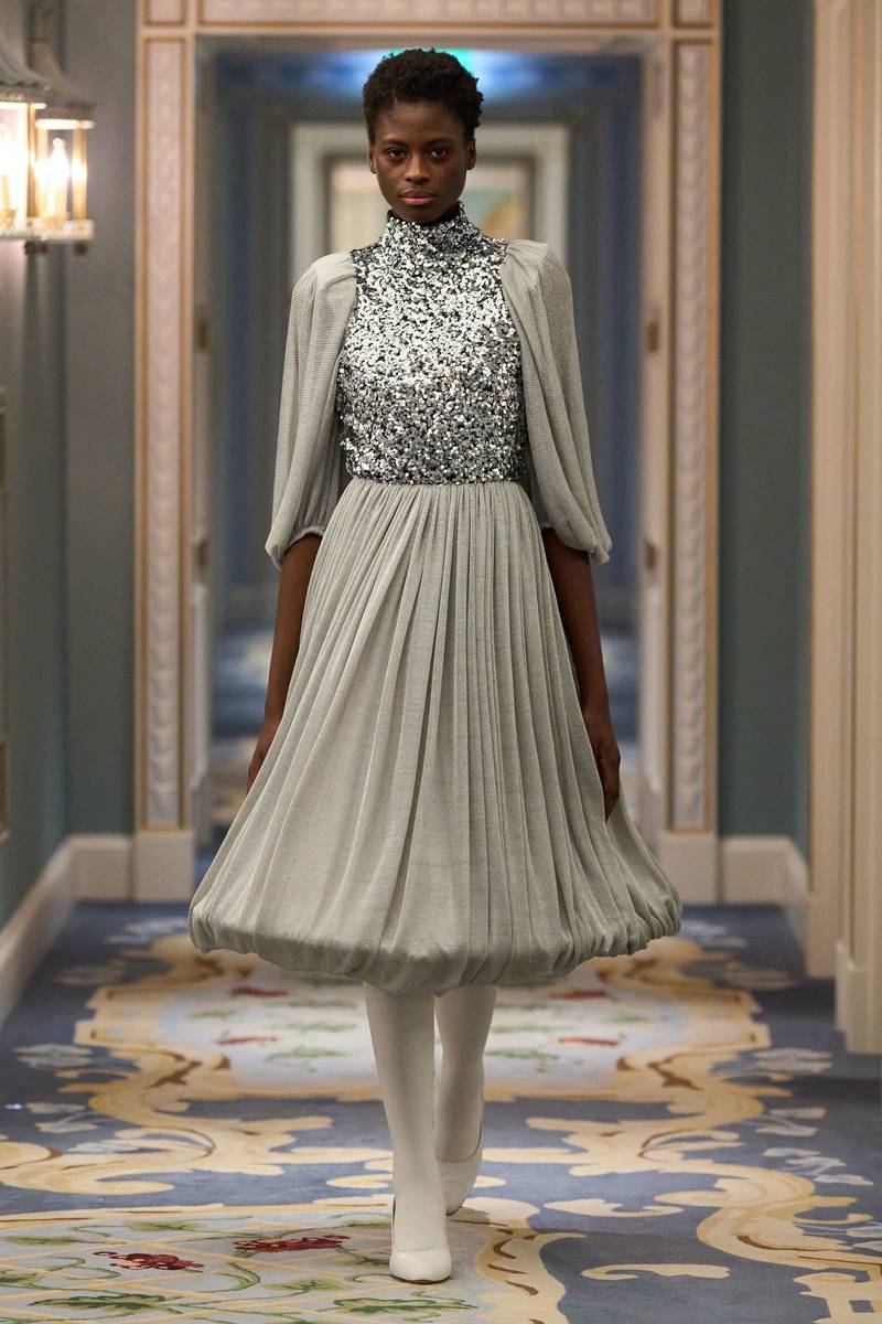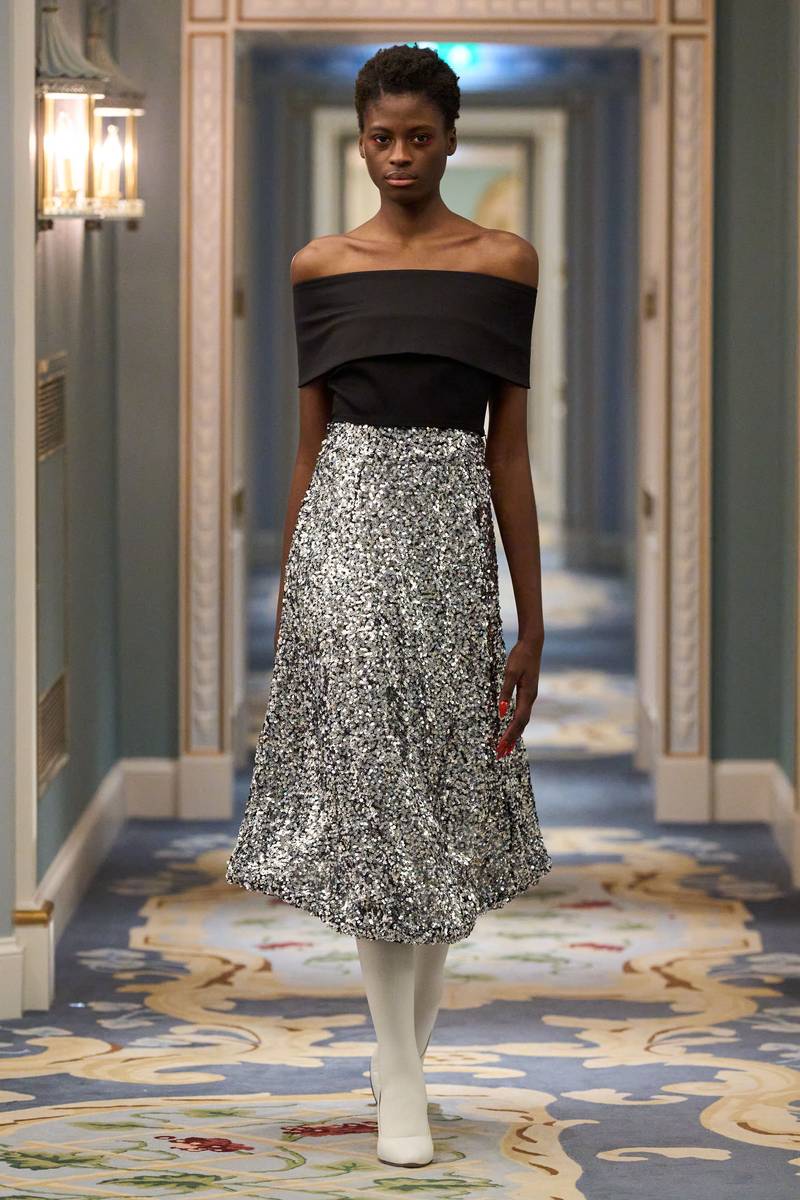 浪漫与实用的平衡:系列中既有适合晚宴的礼服(如金属光泽长款伞裙),也有日常可穿的套装(如宽肩西装+高腰裤),实现了浪漫美学与实用功能的完美交织。