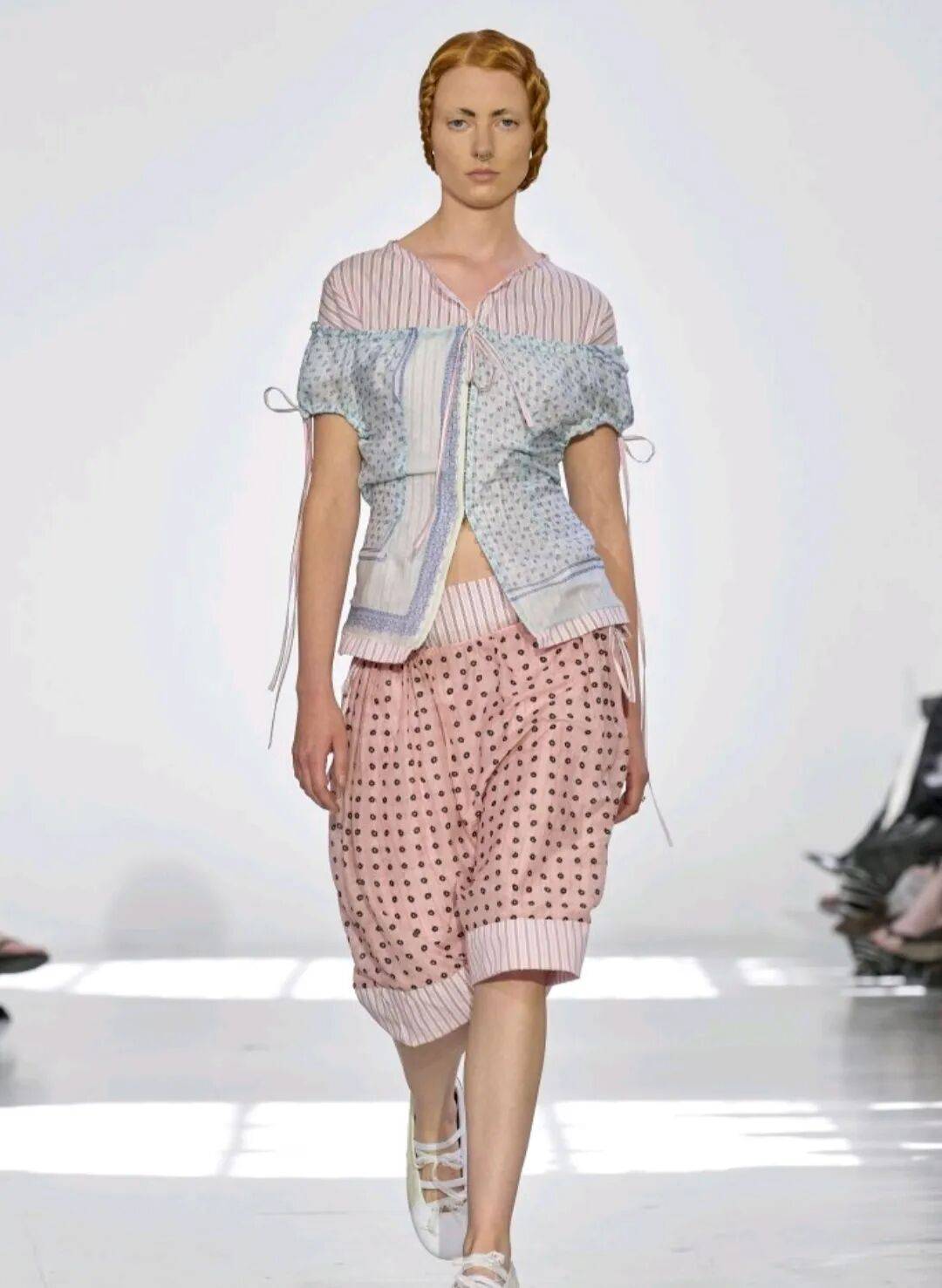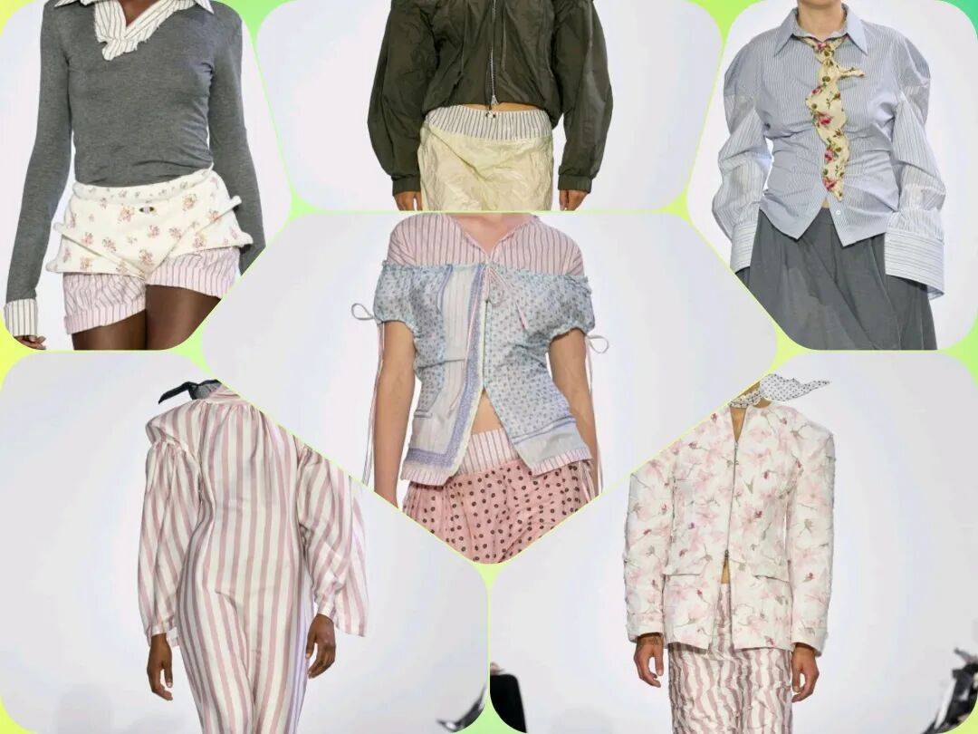 在暗粉色和白色之间的色彩搭配中,色彩的对比也多了不少撞色冲击,在粉色系颜色之上也多了一些粉嫩柔和的少女感,这些粉白色颜色的条纹在纵向的线条之上,也有夸张造型的袖子、碎花的宽松上衣等服装进行搭配,让穿搭也多了不少细节的时尚感。