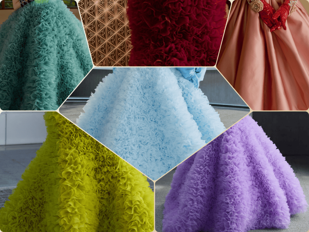 工艺创新:使用金丝唐织面料与 80 米欧根纱手工层叠,强调奢华质感。