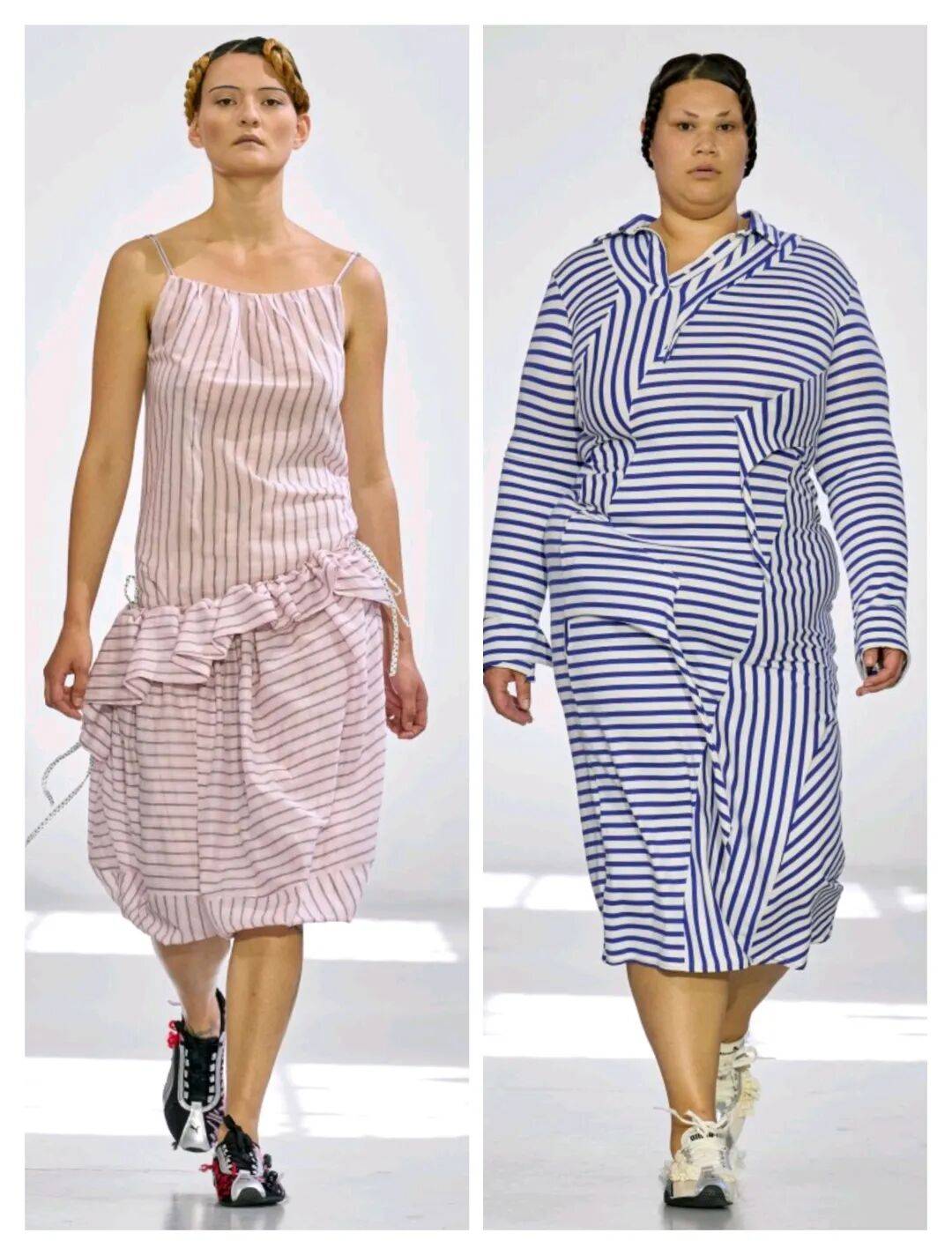 优雅裙装在色彩之间的对比中,这些色彩的撞色冲击也多了条纹图案的简约经典的气质,还在不同方向之间的拼接设计,让裙装也多了一些视线交错的时尚感。