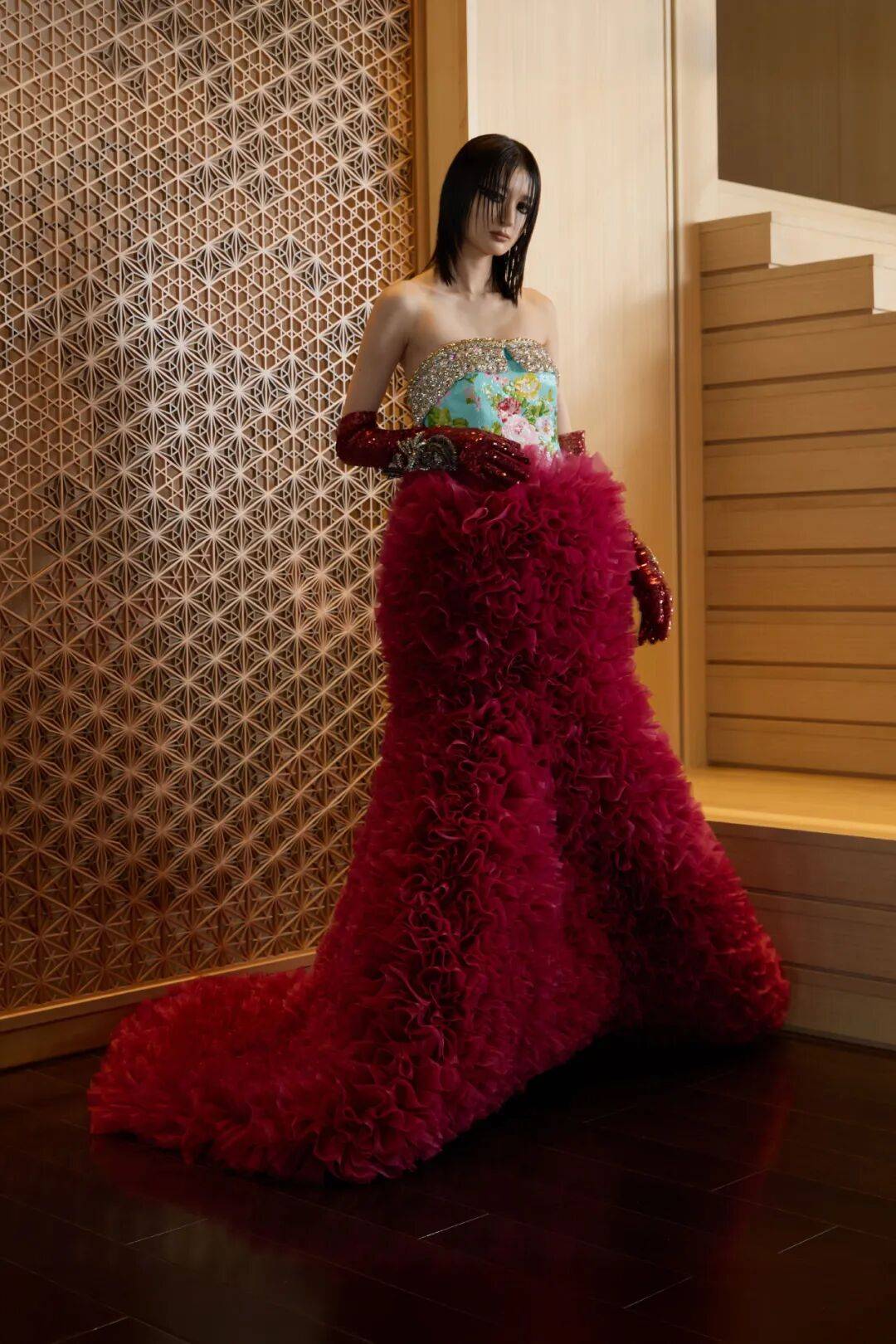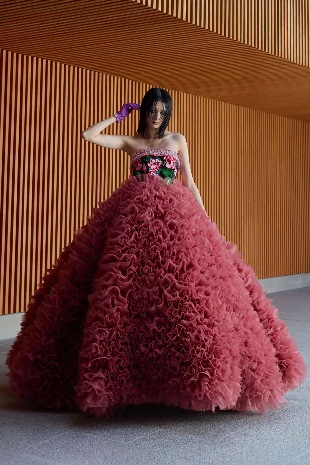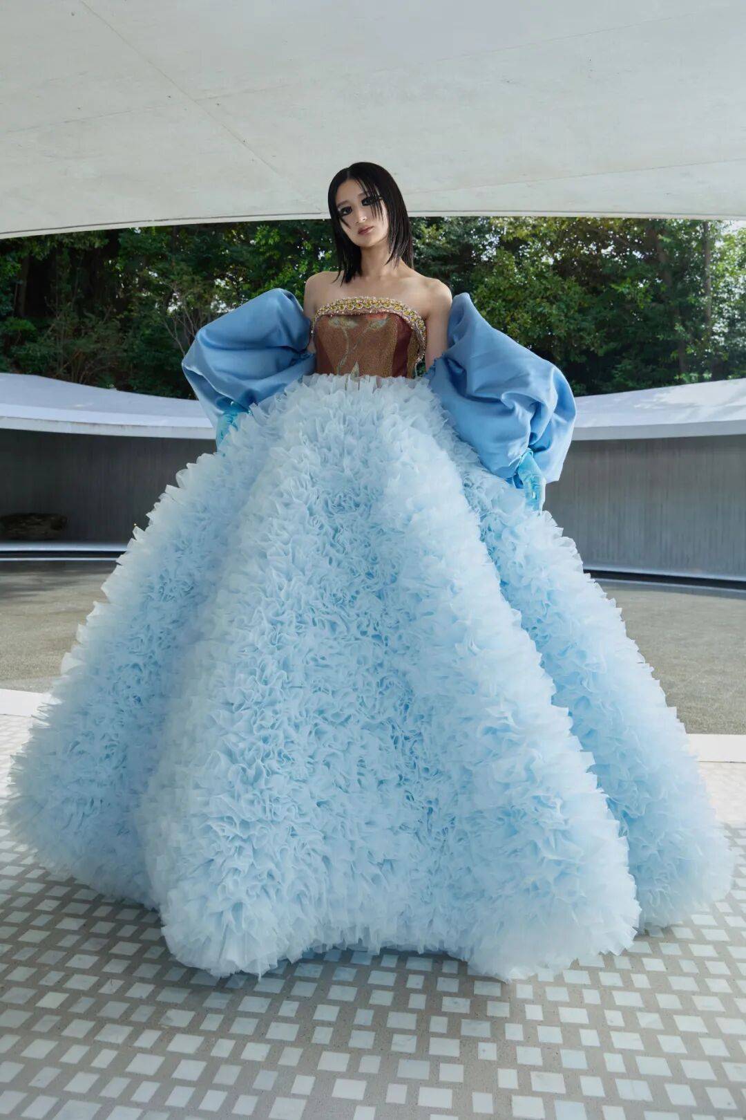 标志性廓形:延续设计师经典的蓬蓬裙,使用约80米日本欧根纱,手工打造层叠荷叶边效果。