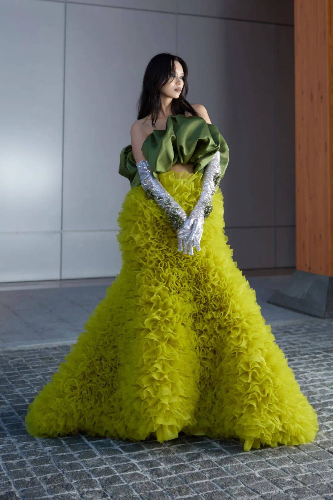 黄绿色颜色的色彩也在鲜艳的色调多了几分清新的气质感,而不同的绿色系的颜色也形成了撞色的冲击感,清新也多了活力的气质,还在拼接的薄纱材质上也多了一些立体褶皱元素的细节感,修身的半身裙在鱼尾的造型上,也有不少曲线的造型感;而和蓬松上半身的搭配中,也多了一些褶皱和廓形的差异感。