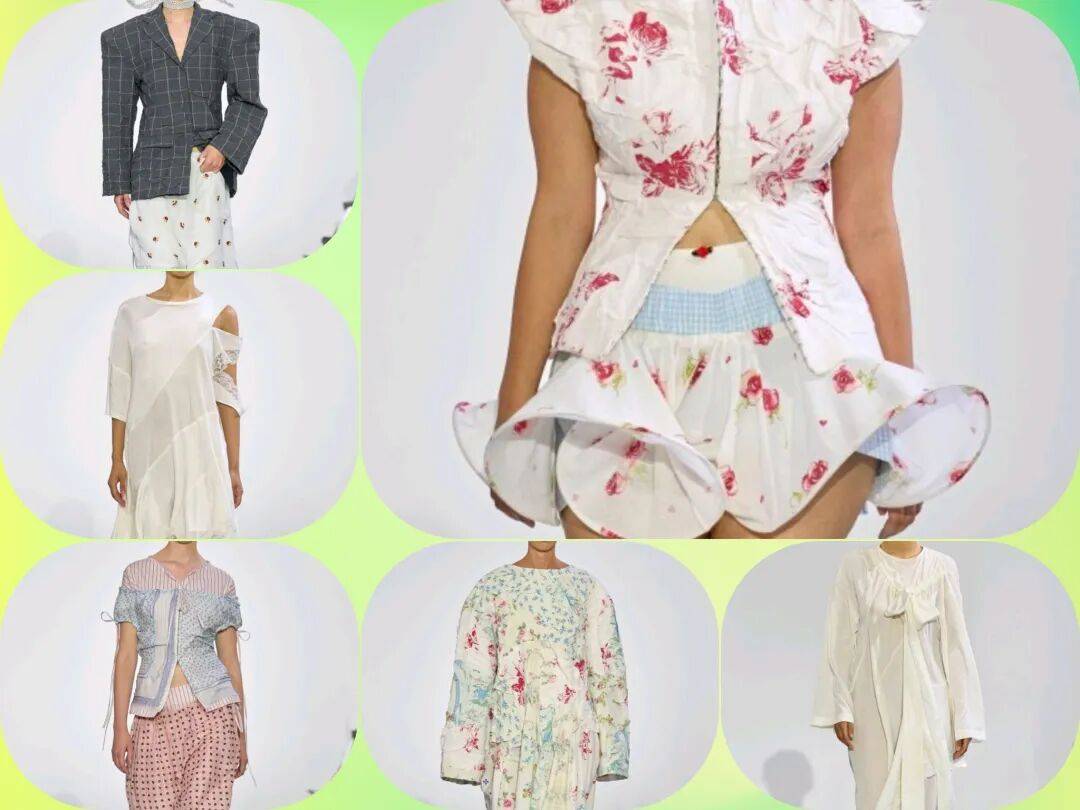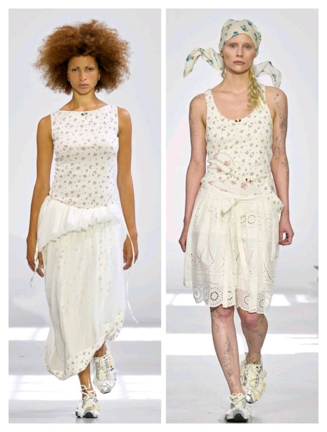 在浅色系的白色系颜色和深色颜色之间的搭配中,色彩的对比带来了更为强烈的撞色冲击感,还在拼接荷叶边褶皱、对比的层次等设计的结合,则让这些服装在视觉冲击中有着更多的细节时尚。