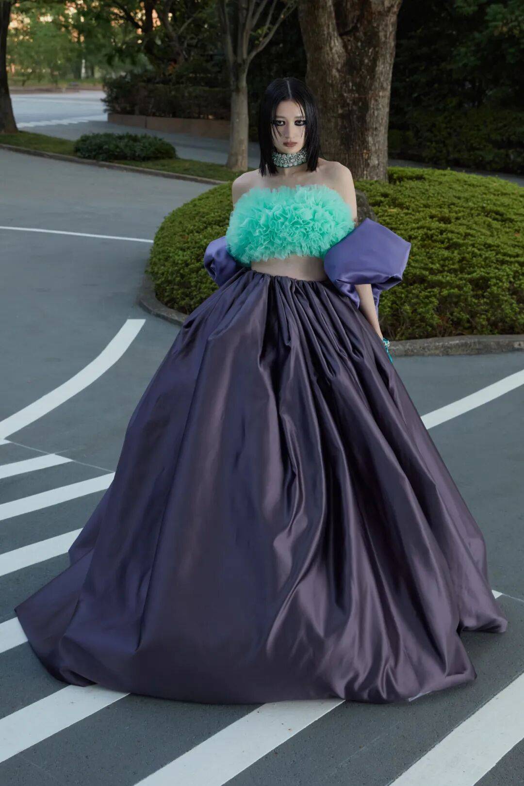 高雅的蓝色廓形蓬松上衣和紫色夸张裙摆的搭配也有着不少视觉对比的冲击感;还在紫色颜色的浪漫气质也增加一些温柔高级感。