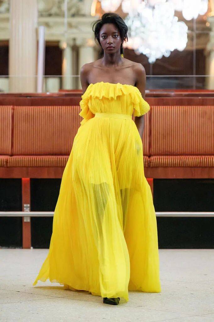 抹胸的金黄色裙装在鲜艳的色调中,还有不少温暖的能量感,纯色的简约还在抹胸和修身收腰的结合增加了身材曲线的温婉,也在轻盈的面料增加了柔软飘逸质感。