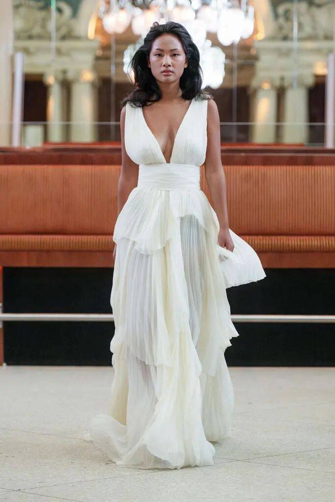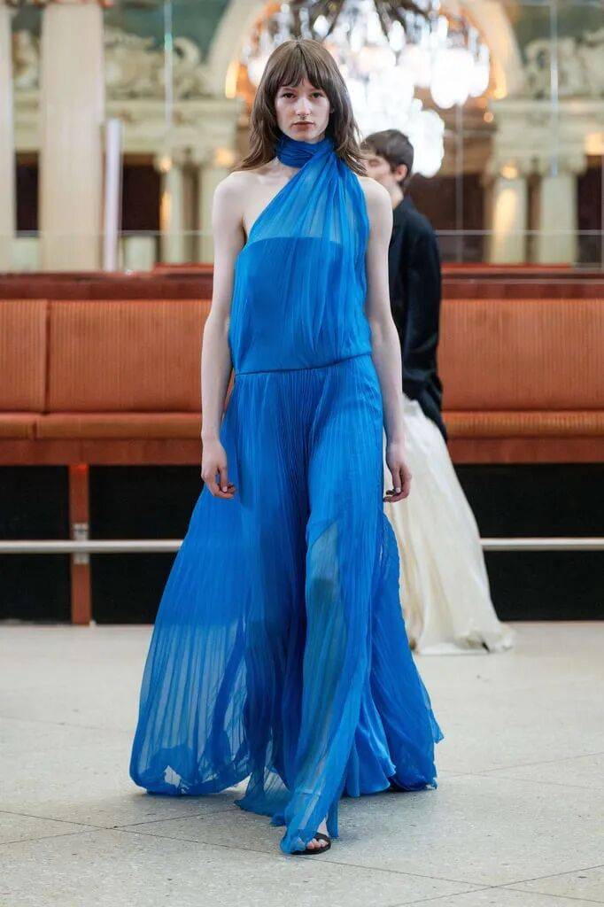 灰蓝色颜色为主的服装在色彩的优雅稳重和几分清新中,抹胸裙装的优雅还在薄纱的轻盈飘逸中,在褶皱元素的纹理细节之上增加了不少的造型时尚感。