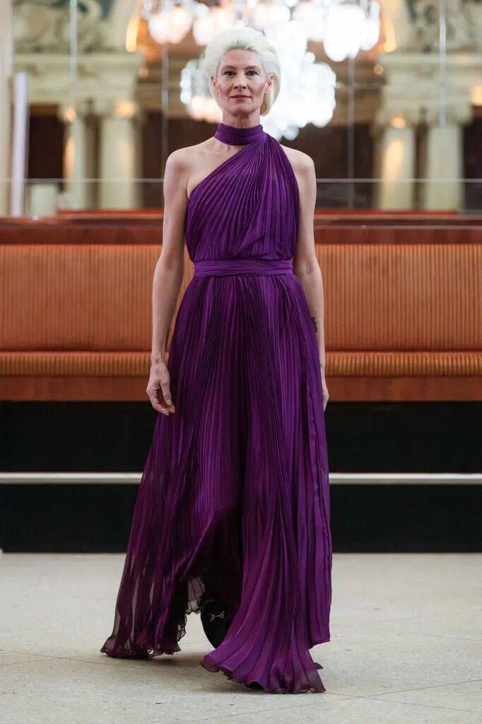 紫色颜色为主的裙装在色彩的高级奢华中,简约纯色结合褶皱元素让裙装在轻盈飘逸中,也更多温婉时尚。