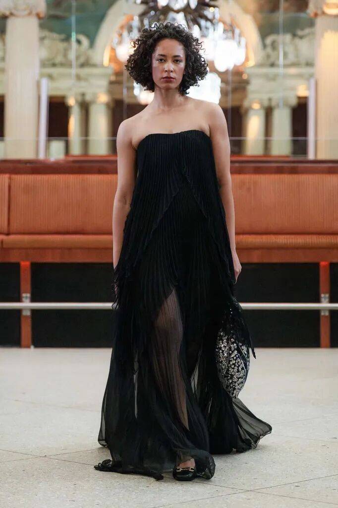 黑色的抹胸裙在A字廓形的裙装上,多了廓形线条感,还在轻薄的面料和褶皱元素进行结合,则让裙装也多了不少朦胧飘逸的时尚感。
