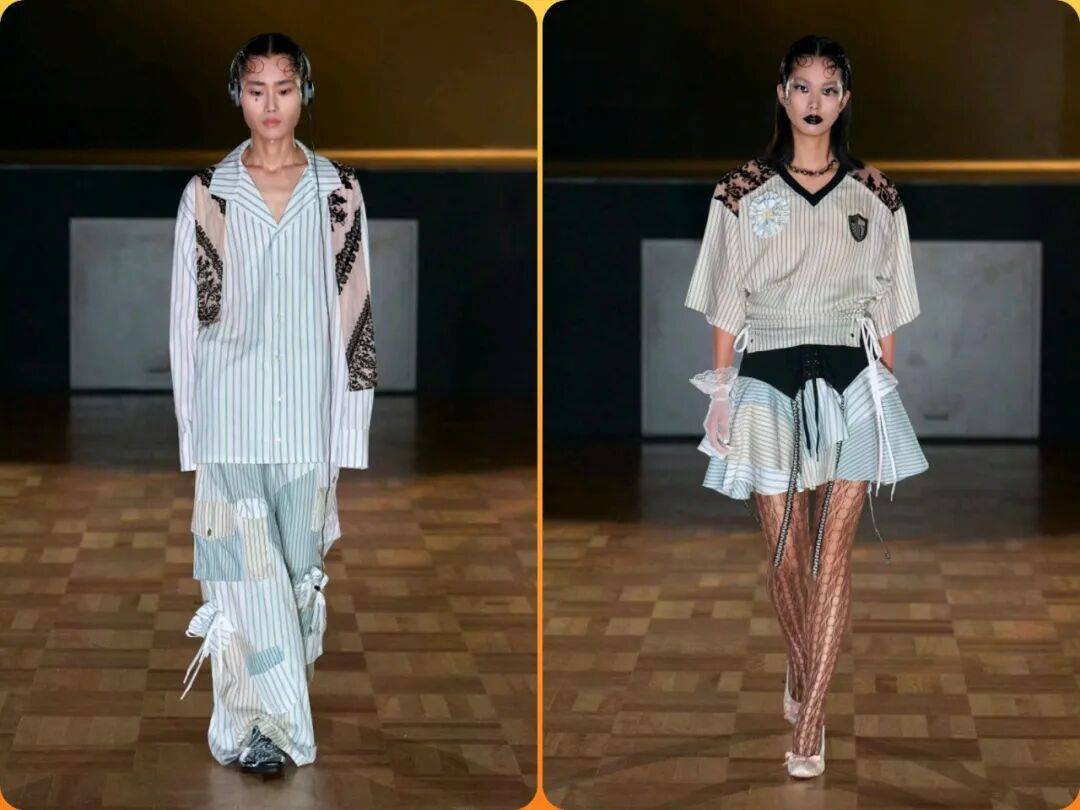 服装在浅色的颜色还多了一些低调的气质感,而色彩的差异也增加了条纹图案的简约经典的气质感,而在和黑色线条等拼接的设计,也在视觉的对比更多了一些线条的细节亮点;在不规则的裙摆线条、露腰等设计,让条纹的服装有更多细节的时尚感。