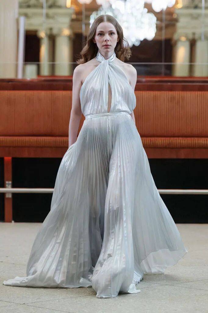 挂脖款式的连衣裙在浅灰色颜色的低调大方的气质上,还有光滑面料增加了一些光泽面料的纹理质感,也在扭结的褶皱、风琴褶皱、镂空设计、不规则下摆线条等设计的相互结合,则让连衣裙也多了细节的时尚感。