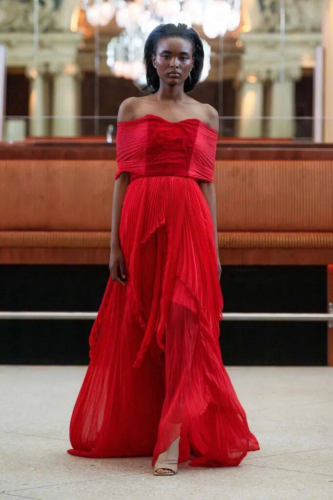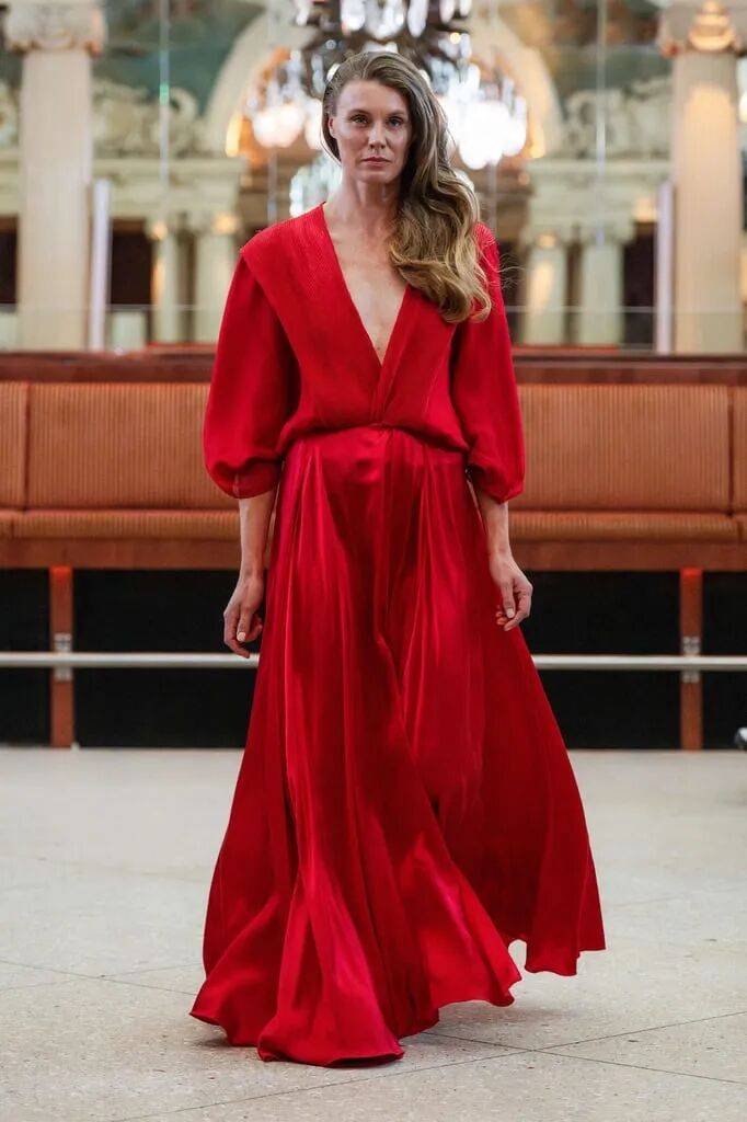 红色颜色的服装在鲜艳的色调中,也多了不少热情的气质感,在裙装的优雅温婉中,还有造型感袖子、深V字衣领等设计的结合,让红色的裙装也多了不少的细节时尚。
