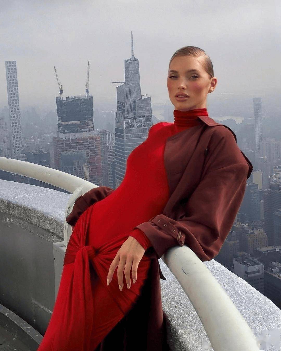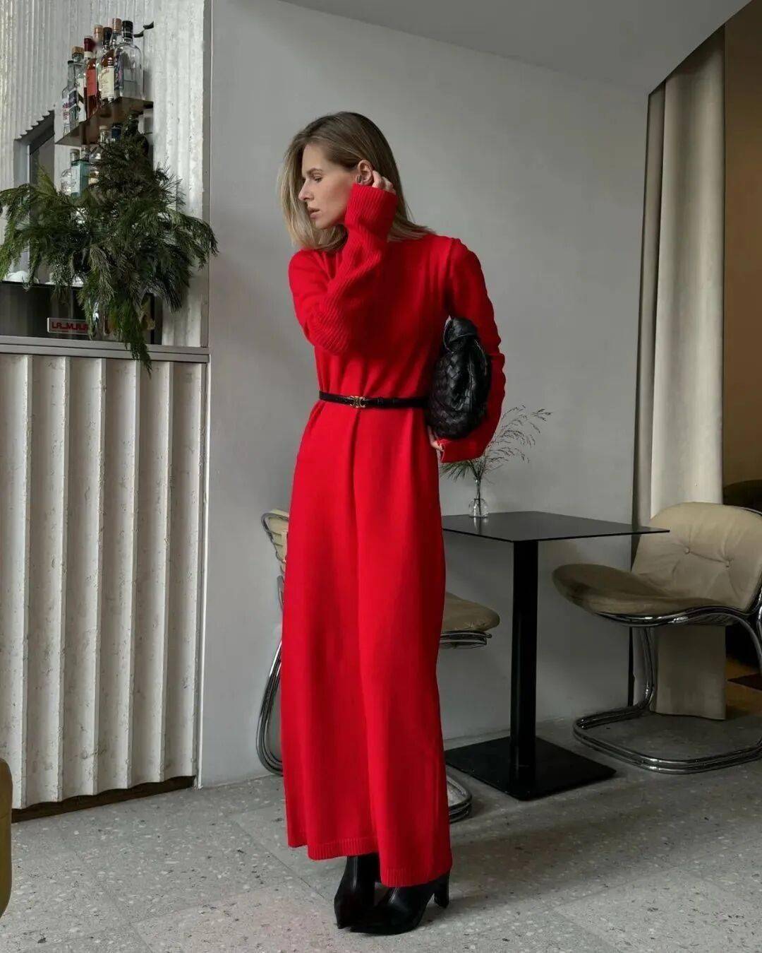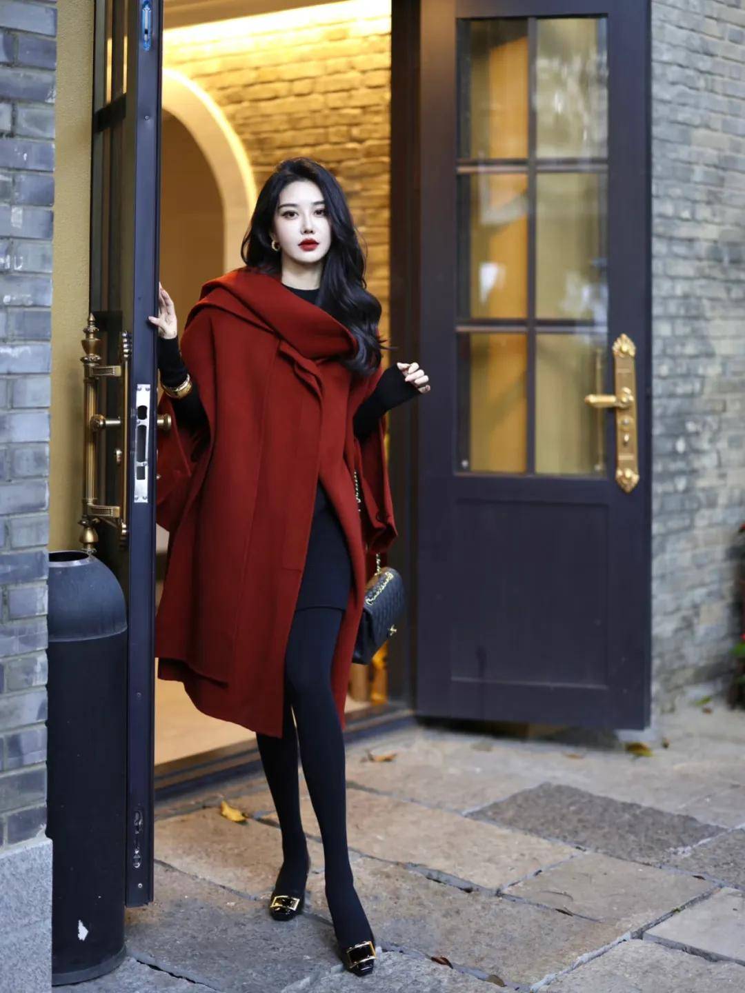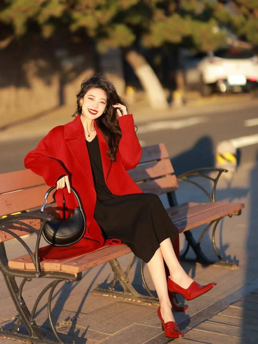 红色大衣黑色高领毛衣和一条优雅的黑色长裙,则在视觉上形成经典的红黑配色对比,既显得高贵又充满时尚感。