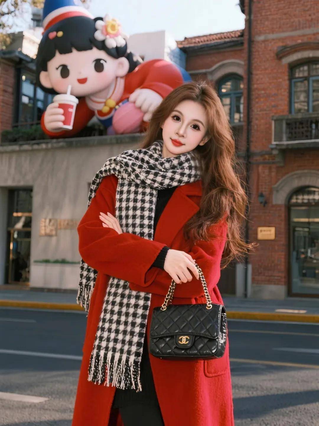 格纹围巾简约又经典的图案,中和了红色大衣的张扬感,同时为整体增添了一抹优雅与从容,显得格外醒目和温暖,完美地展现出一种时尚与实用并存的冬季穿搭风格。