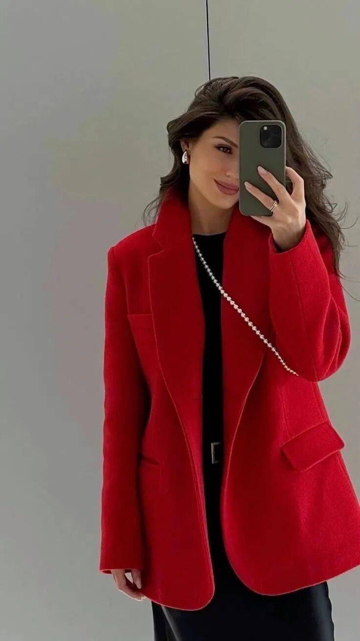 一件鲜艳的红色大衣作为整体穿搭的核心单品,能够瞬间提升气场与时尚感,内搭可以选择简约的基础款毛衣来平衡视觉效果。